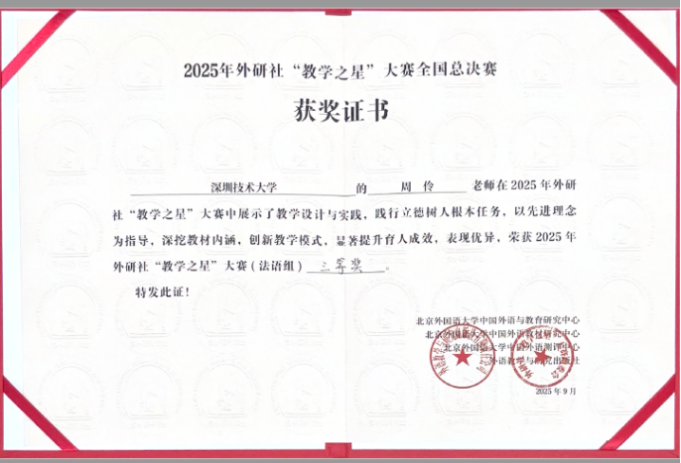 2025年9月19日,外研社“教学之星”大赛全国总决赛(法语组)在山东威海顺利举行。深圳技术大学外国语学院法语教师周伶凭借优异表现,荣获全国三等奖,展现了我校外语教师扎实的教学功底与创新精神。