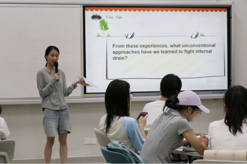 接着进入第三个环节——“Free Talk”(自由会话)。主持人抛出精心设计的“Leading Questions”(引导性问题),同学们围绕问题各抒己见、深入交流。在热烈的讨论中,大家对生活中的巧技奇招形成了更深刻的思考,这些想法也在真诚的表达与轻松的氛围里自然流露,比如有的同学强调学会适当使用AI工具提高了生活便利性。正如生活需要巧用妙招来化解琐碎、缓解焦虑,这场自由交流也为同学们搭建了实践平台。在本环节的最后阶段,大家积极上台分享亲身经历与心得,不仅有效锻炼了英语口语表达能力,更逐步树立起在公共场合发言的信心。