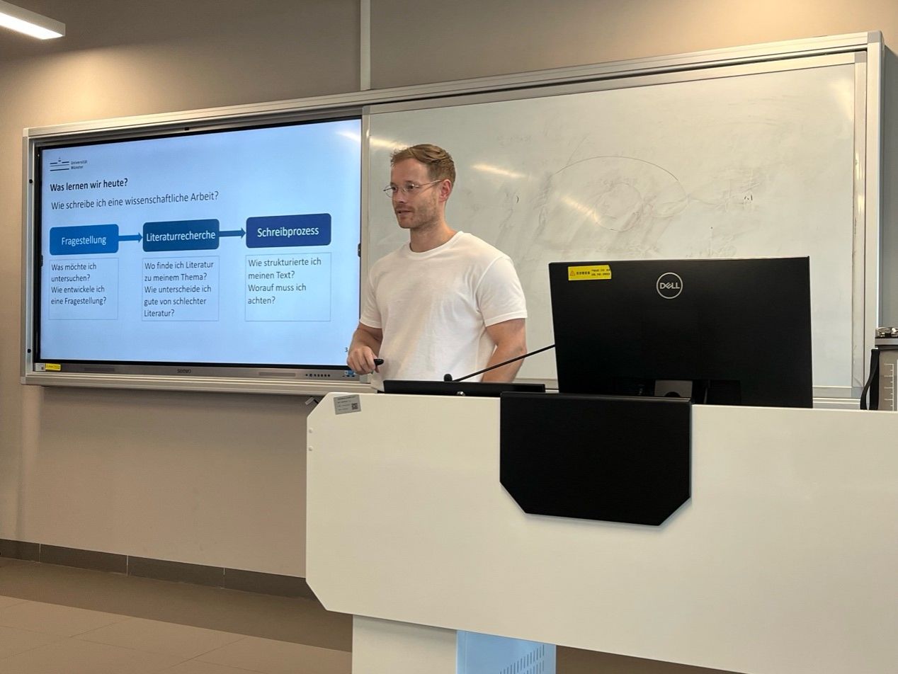 2025年10月15日下午,外国语学院在B2-1118举办了主题为“Wie schreibe ich eine (Abschluss-)Arbeit(如何写一篇学术论文?)”的讲座。此活动为我校、德国多特蒙德工业大学与意大利热那亚大学合作参与的德国学术交流中心(DAAD)日耳曼语言文化院系伙伴项目(GIP)成果之一。