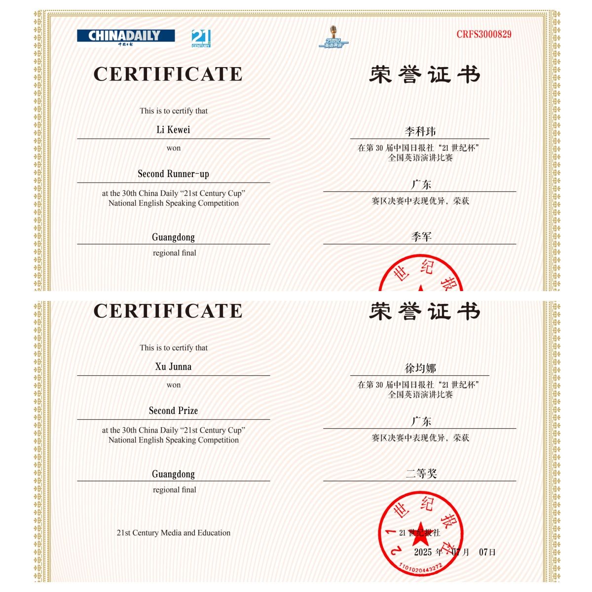 图3.李科玮(上图)和徐均娜(下图)的省赛获奖证书