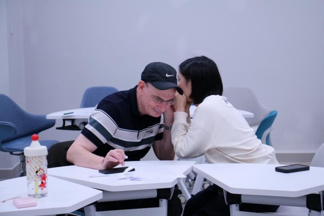 活动的第一个游戏是““Whisper Challenge”(”(““传话挑战”)”)。参与者抽纸条分组,纸条标注1为平民、2为卧底。大家按顺序用耳语传递指定英语语句,卧底需悄悄篡改内容。传话结束后,众人根据初始指定语句与最终传递语句的差异投票指认卧底,揪出卧底则平民胜,反之卧底胜。这个充满互动性的游戏不仅快速活跃了现场气氛,更让同学们在趣味比拼中锻炼了英语听力与口语表达能力,收获颇丰。