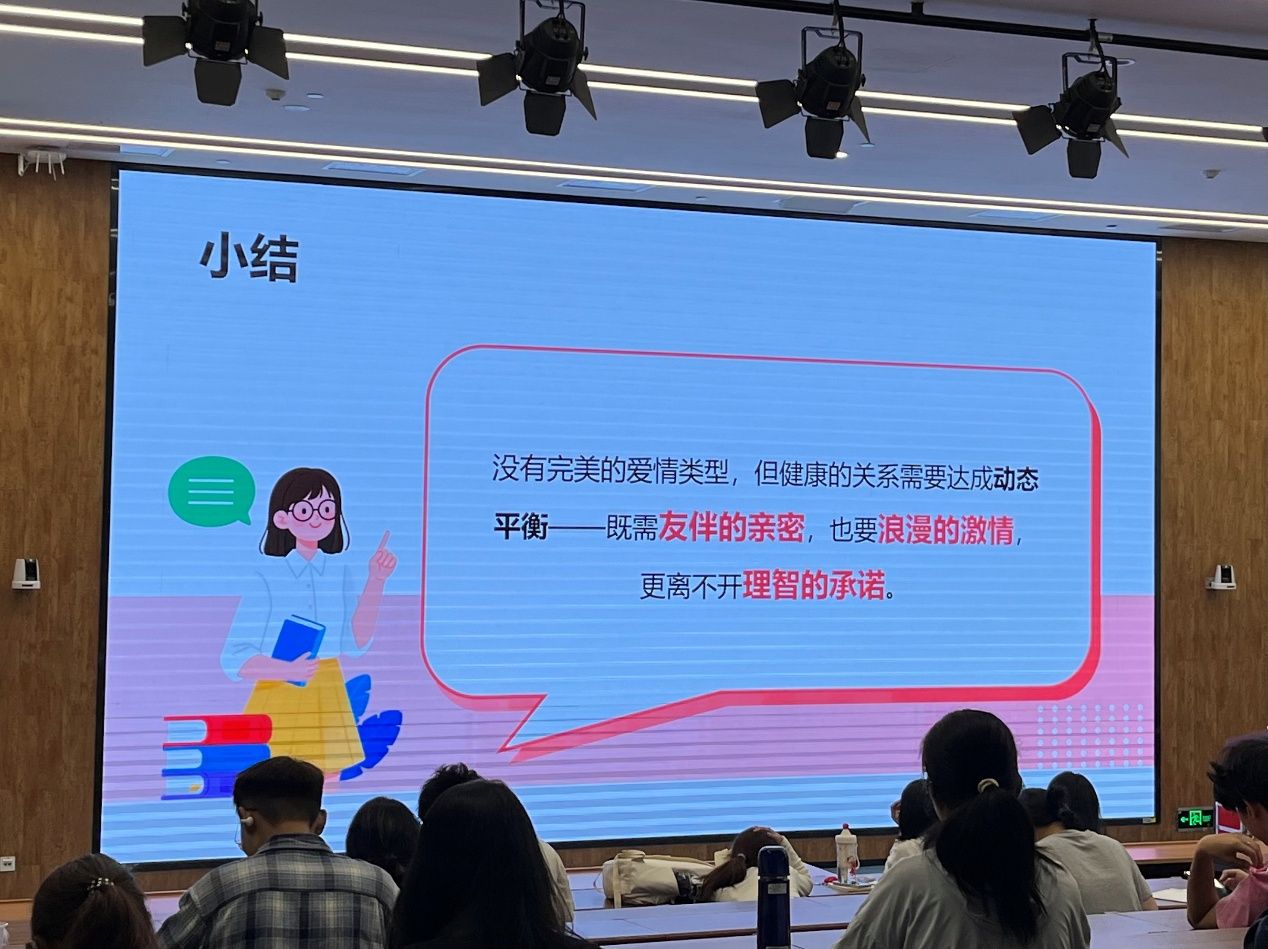 讲座最后,叶老师详细阐述了如何经营感情,并描绘了健康爱情观的样貌。她强调,健康的关系应是一种动态平衡——既包含友伴般的亲密,也需浪漫的激情,更离不开理性的承诺。
