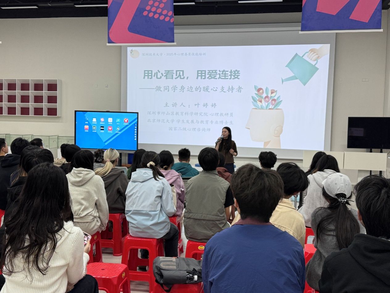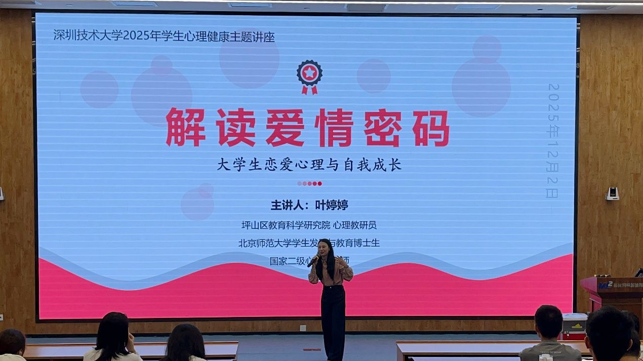 除了针对学生骨干的专业培训,学院也持续关注广大学生普遍存在的心理发展议题。12月2日14:30,由深圳技术大学外国语学院心理辅导站主办的2025年学生心理健康主题讲座在B2-101阶梯教室举行。本次讲座以“大学生恋爱心理与自我成长”为主题,围绕恋爱中的情绪管理、信号识别、沟通技巧等实用内容展开,旨在帮助学生掌握心理调适方法,妥善应对亲密关系冲突,以积极心态实现自我成长。讲座特邀坪山区教育科学研究院心理教研员、北京师范大学学生发展与教育博士生、国家二级心理咨询师叶婷婷主讲,为同学们从心理学角度“解读爱情密码”。