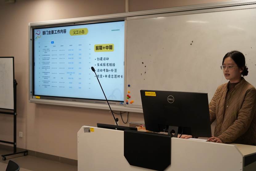 随后,外院义工联会长练怡芬率先发言,梳理义工联过往工作成果,阐述未来发展规划,传递携手深耕志愿事业的决心。紧接着,各部门部长依次登场,详解部门职能与工作重点:宣传部部长杨晓介绍部门负责拍摄、文案撰写及推文排版的核心工作,提及将以细节传递温暖;办公室部长陈晨曦说明部门协助活动开展、保障流程推进、联通各类信息的职责,强调需熟悉志愿平台操作、把控活动全流程;实践部部长郑港正讲解部门活动策划、社区对接及推动团支部志愿活动的工作内容,明晰实践落地方向。各骨干的分享,让新成员清晰了解义工联架构与运作模式,筑牢工作认知基础。