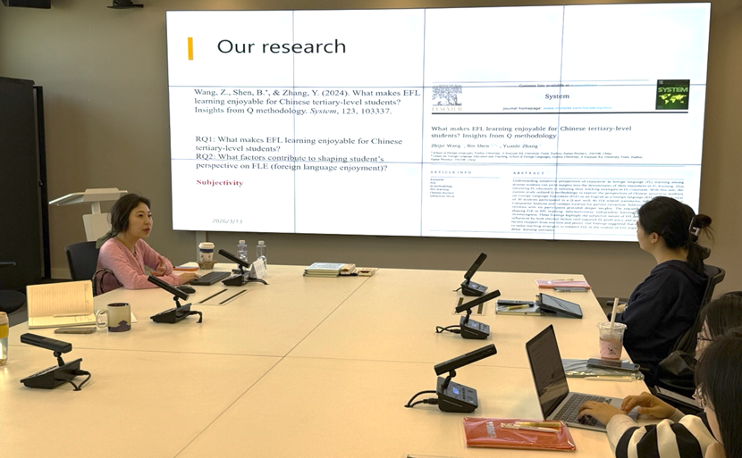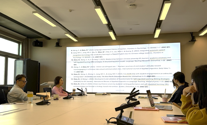 讲座伊始,沈彬博士结合自身学术经历与研究成果,介绍了其在计算机辅助外语学习、二语写作、自我调控学习策略等领域的持续探索。她指出,在当前应用语言学研究不断走向交叉融合的背景下,关注学习者主观体验、提升实证研究设计能力、增强国际发表意识,已成为外语教育研究的重要方向。