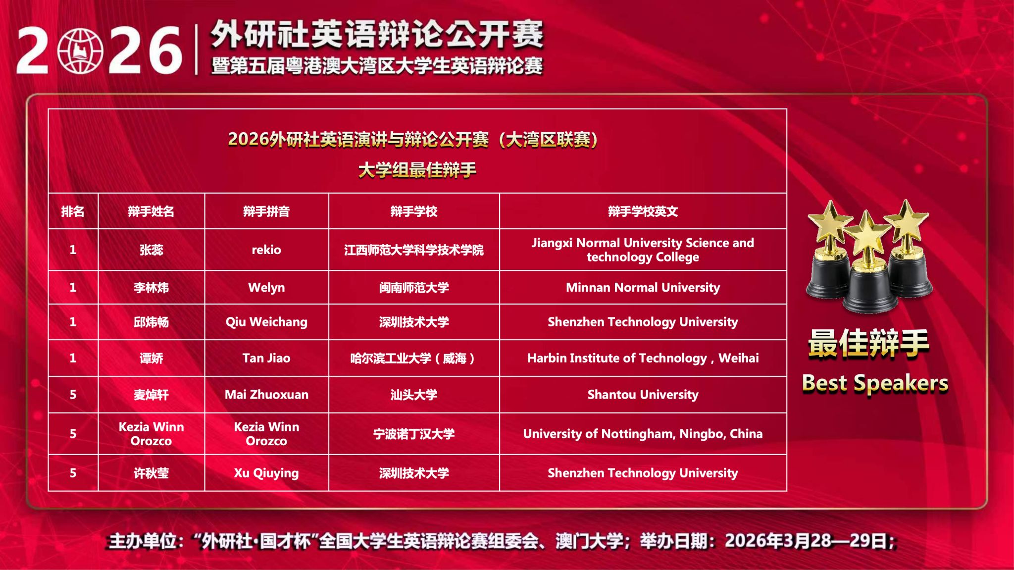 本次比赛作为2026年英语辩论征程的崭新起点,希望同学们以此次成绩为激励,总结经验、砥砺前行,在今后的赛事中再接再厉、再创佳绩!