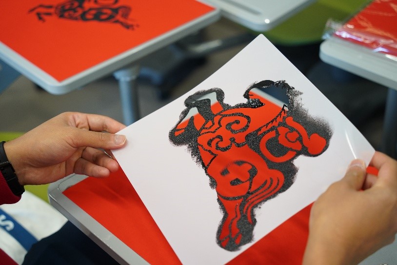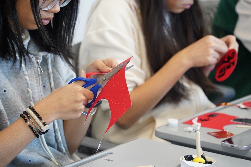 传统剪纸体验:指尖流转藏巧思,一纸一剪纳吉祥——既有奔马踏春的马年专属造型,亦有燕子报喜、柿子(寓意事事如意)、莲花(象征连年有余)等吉祥纹样。同学们用剪刀裁出层层祝福,让非遗技艺裹着新春寓意,在指尖焕发生机。