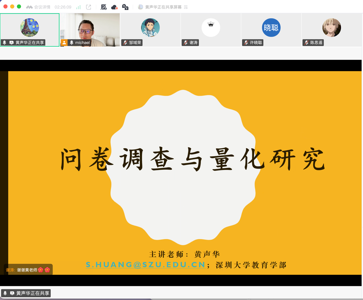 2024年11月23日下午,深圳技术大学外国语学院技术增强语言学习中心青年智汇论坛第九场讲座成功举办。本次讲座特邀深圳大学教育学部湾区教育研究院副教授黄声华博士主讲,主题为《外语教育方向学位论文写作之问卷调查与量化研究》。讲座于14:00-16:40通过腾讯会议线上平台进行,吸引了中心成员、学院教师及研究生等30余名师生参与。