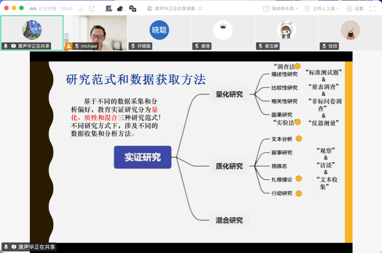 黄教授的讲座内容系统且深入浅出,聚焦教育量化研究的核心方法论,为外语教育方向的学位论文写作提供了完整的操作指南。讲座围绕三大核心模块展开:量化调查数据的作用、数据来源,以及问卷调查的注意事项,为打算从量化角度以问卷法做学位论文的各年级学生打下了扎实的方法论基础。
